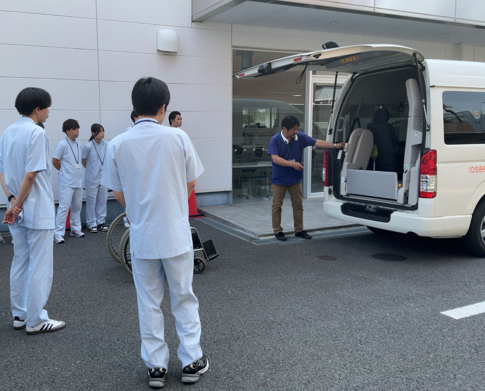 今年度も介護実習に参加する前に学内で車いすを使用し、デイサービスで使用されている福祉車両(今回はリアリフト)に乗りました。