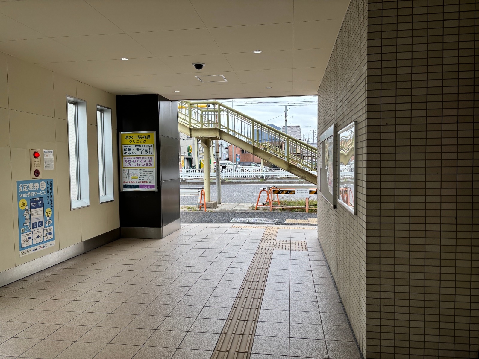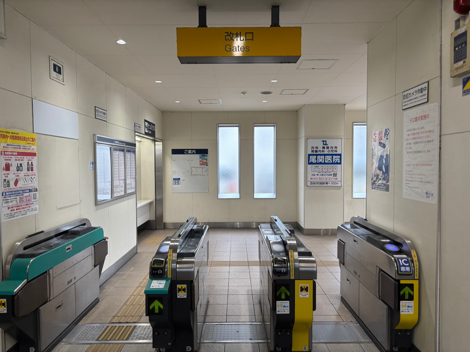 駅の東側には黄色の看板の【よねだ整形リハビリクリニック】が見えます。