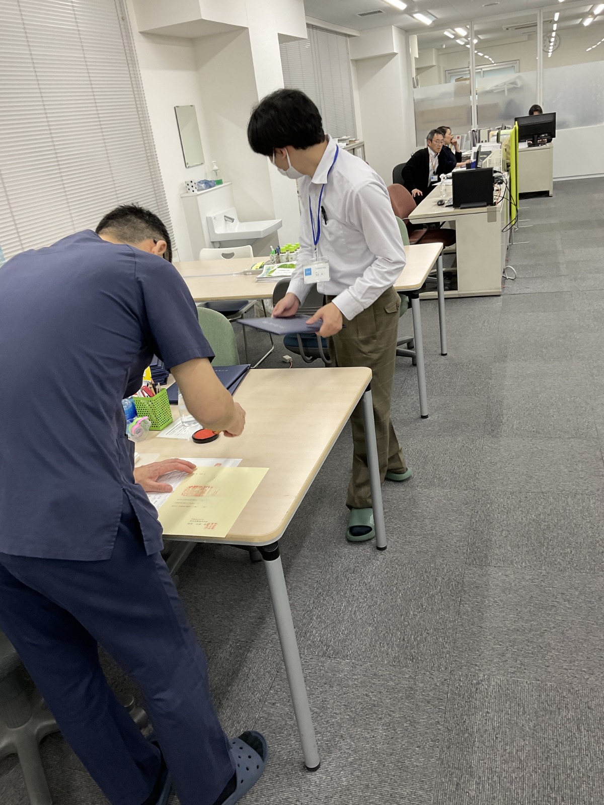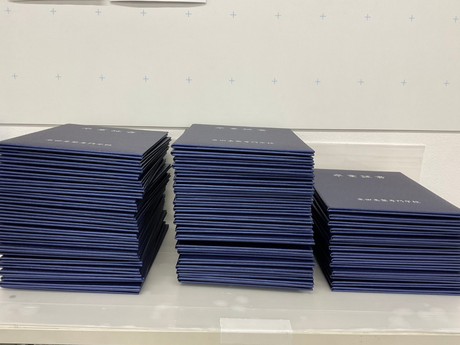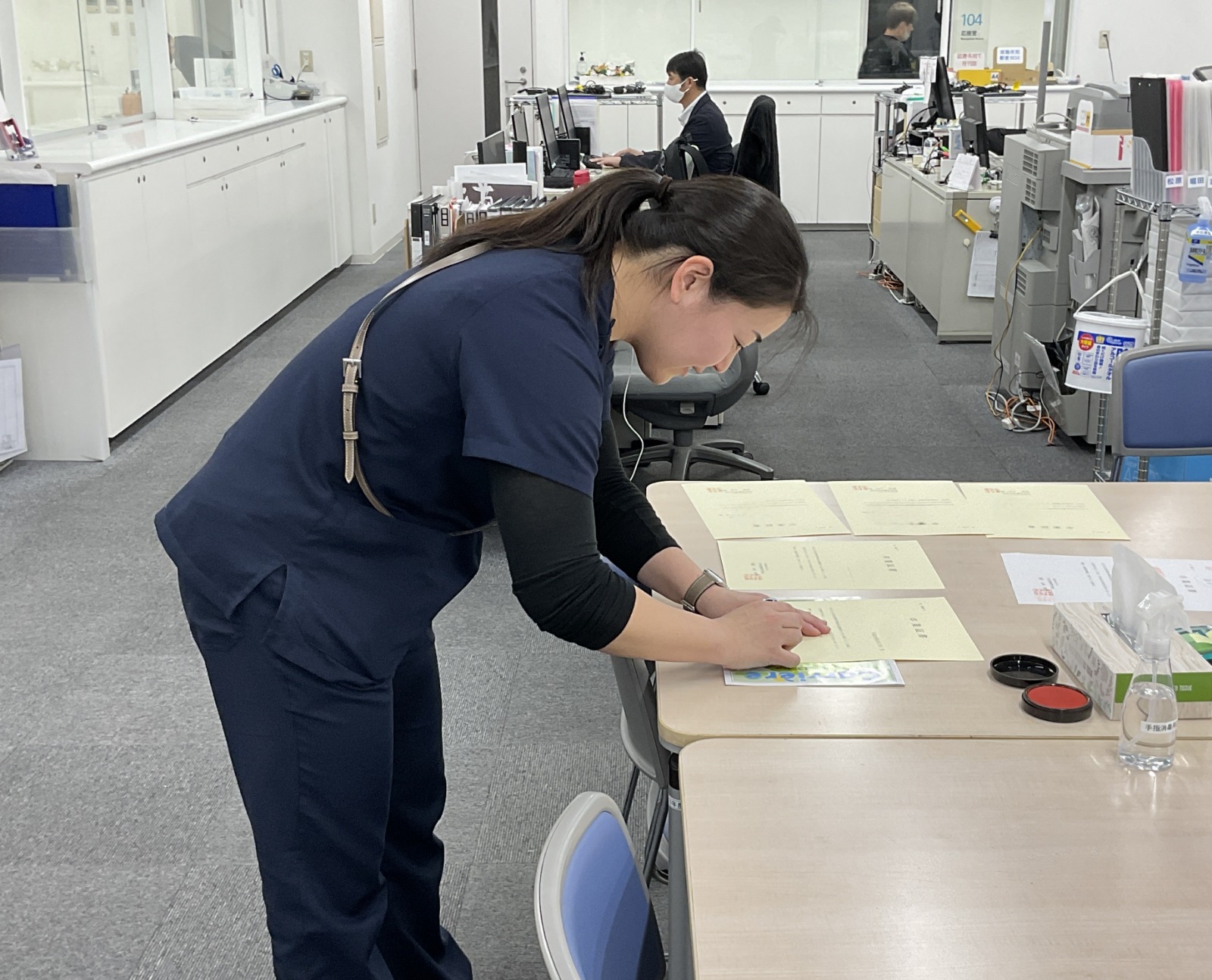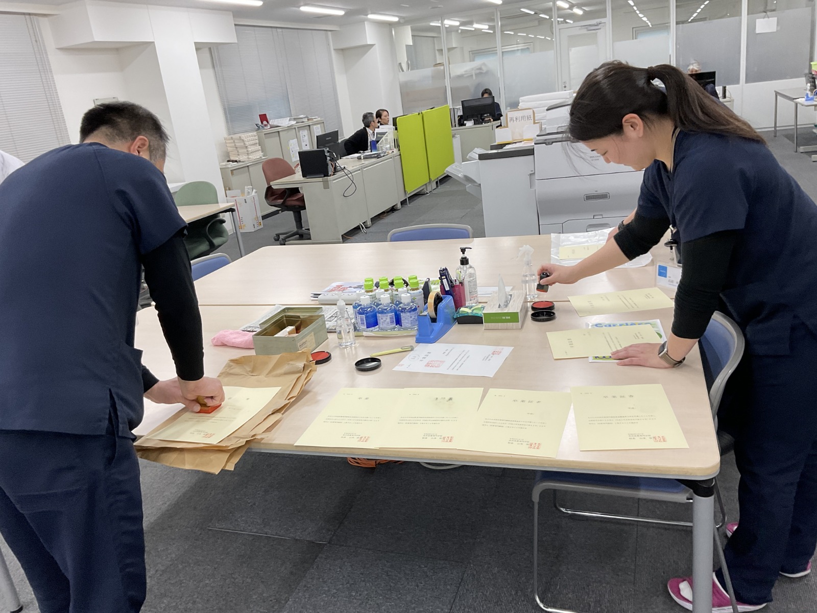 卒業式当日にお渡しする“卒業証書”を3年生の先生たちと渋谷さんが1枚1枚丁寧に