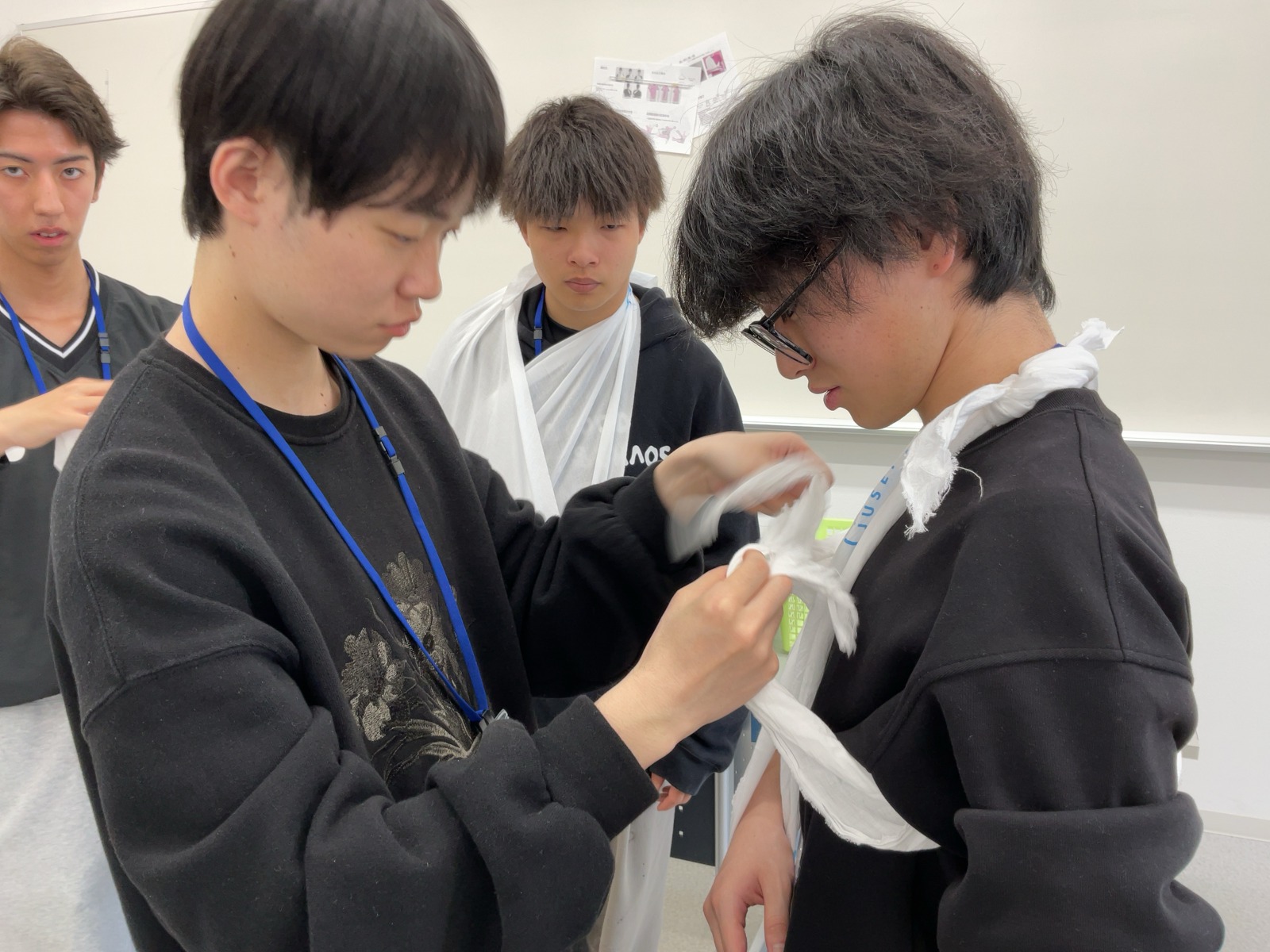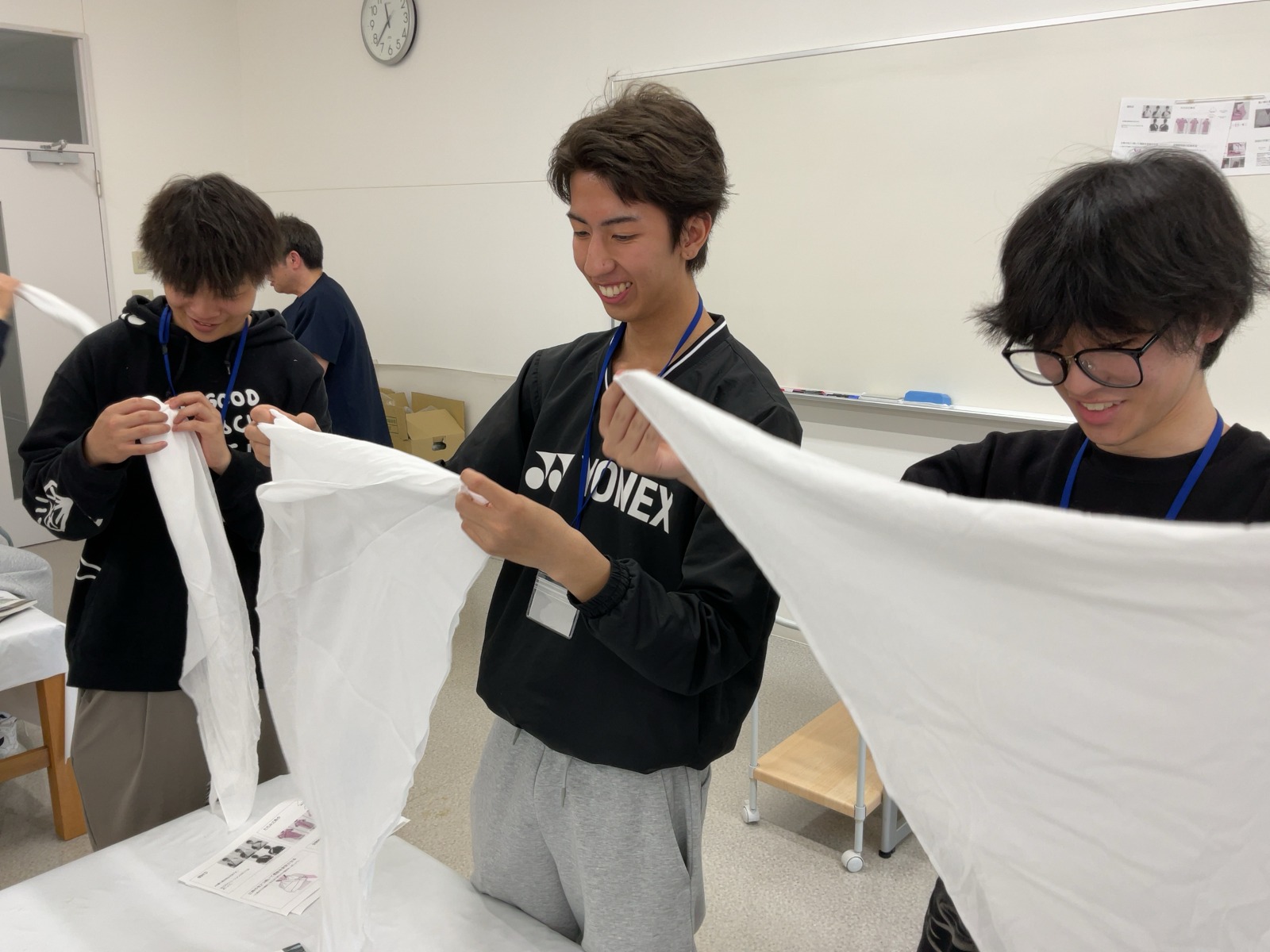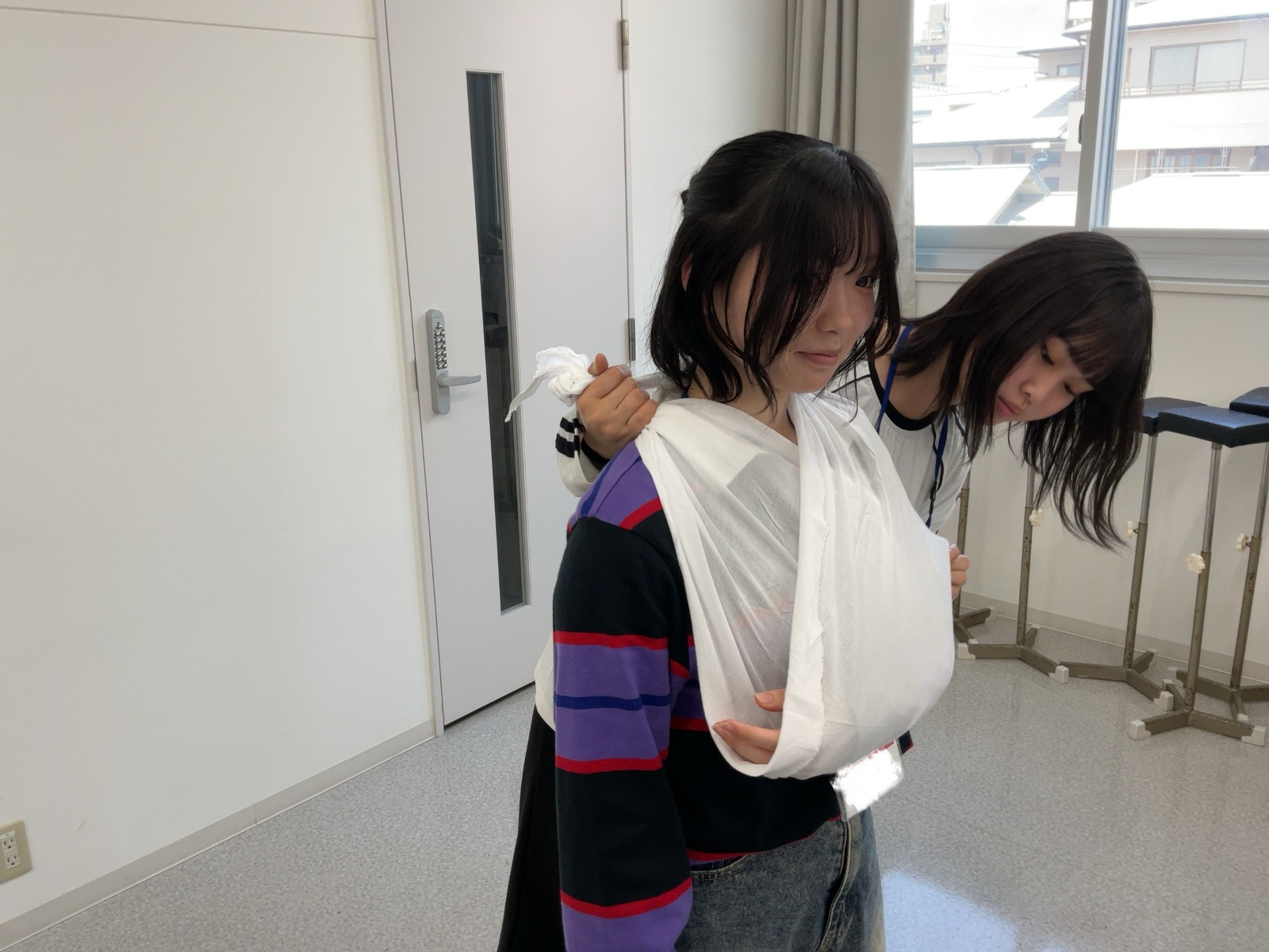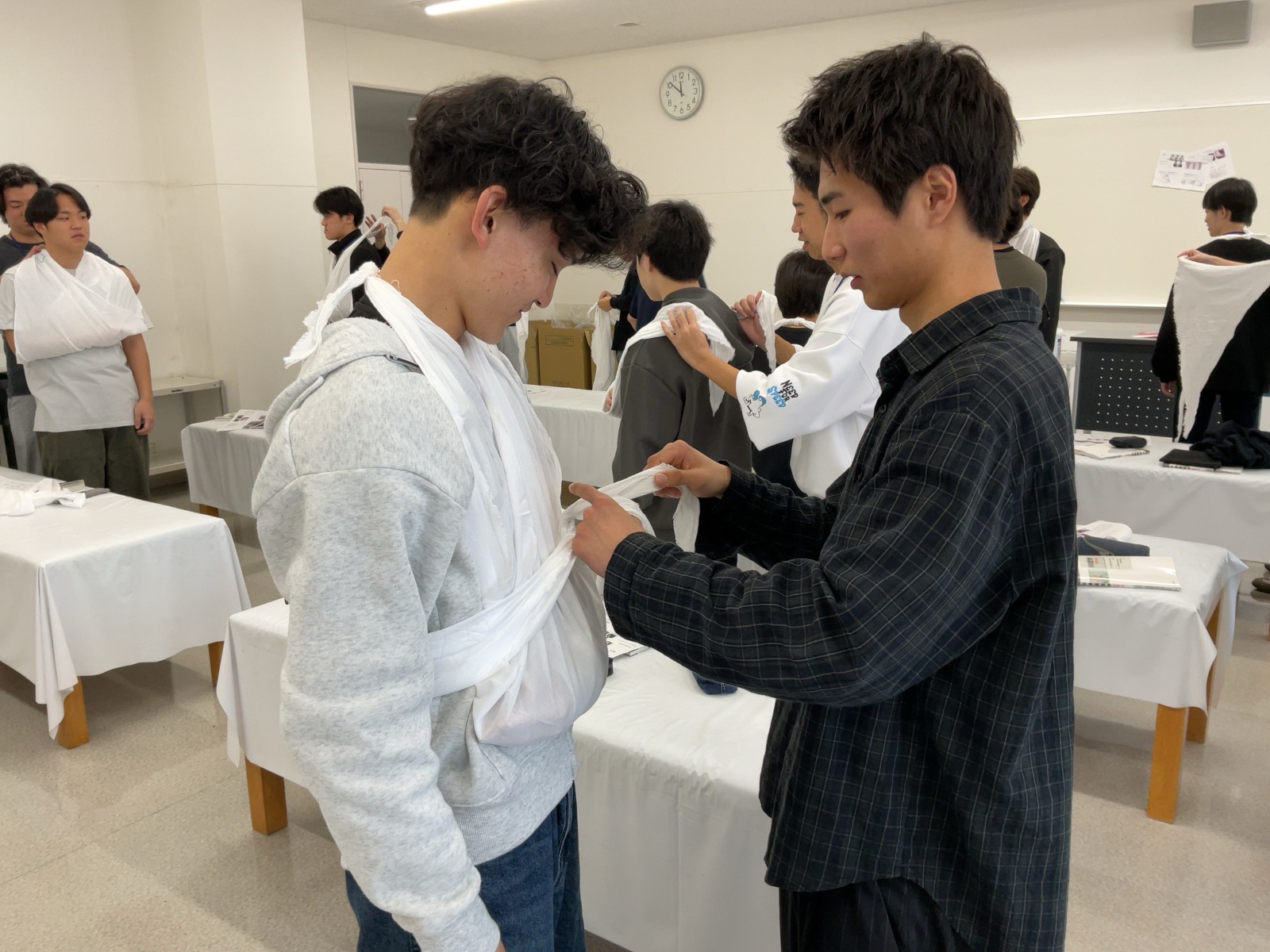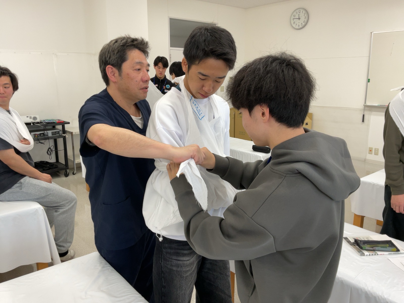 松原Tから三角巾の折り方を教わる