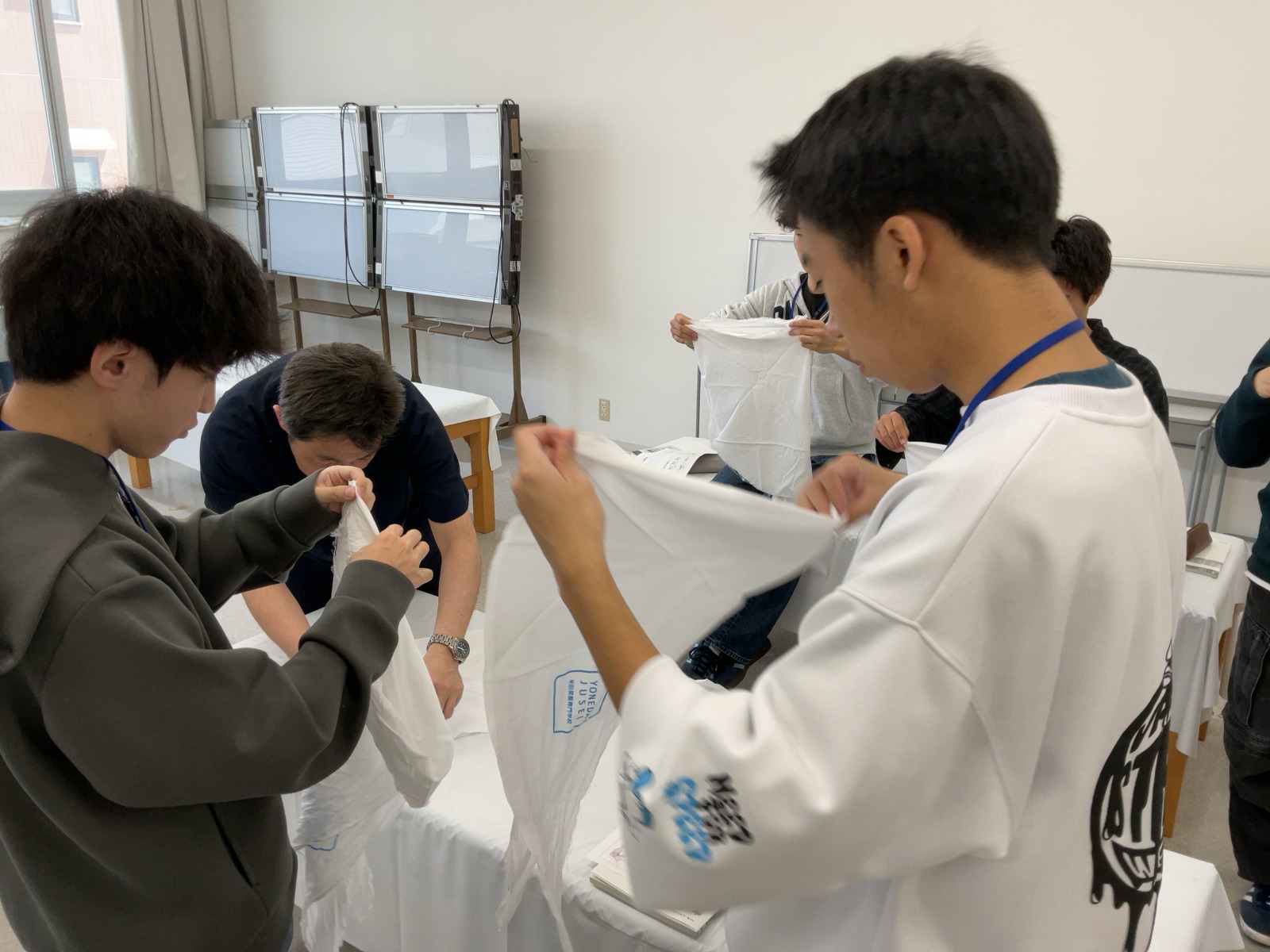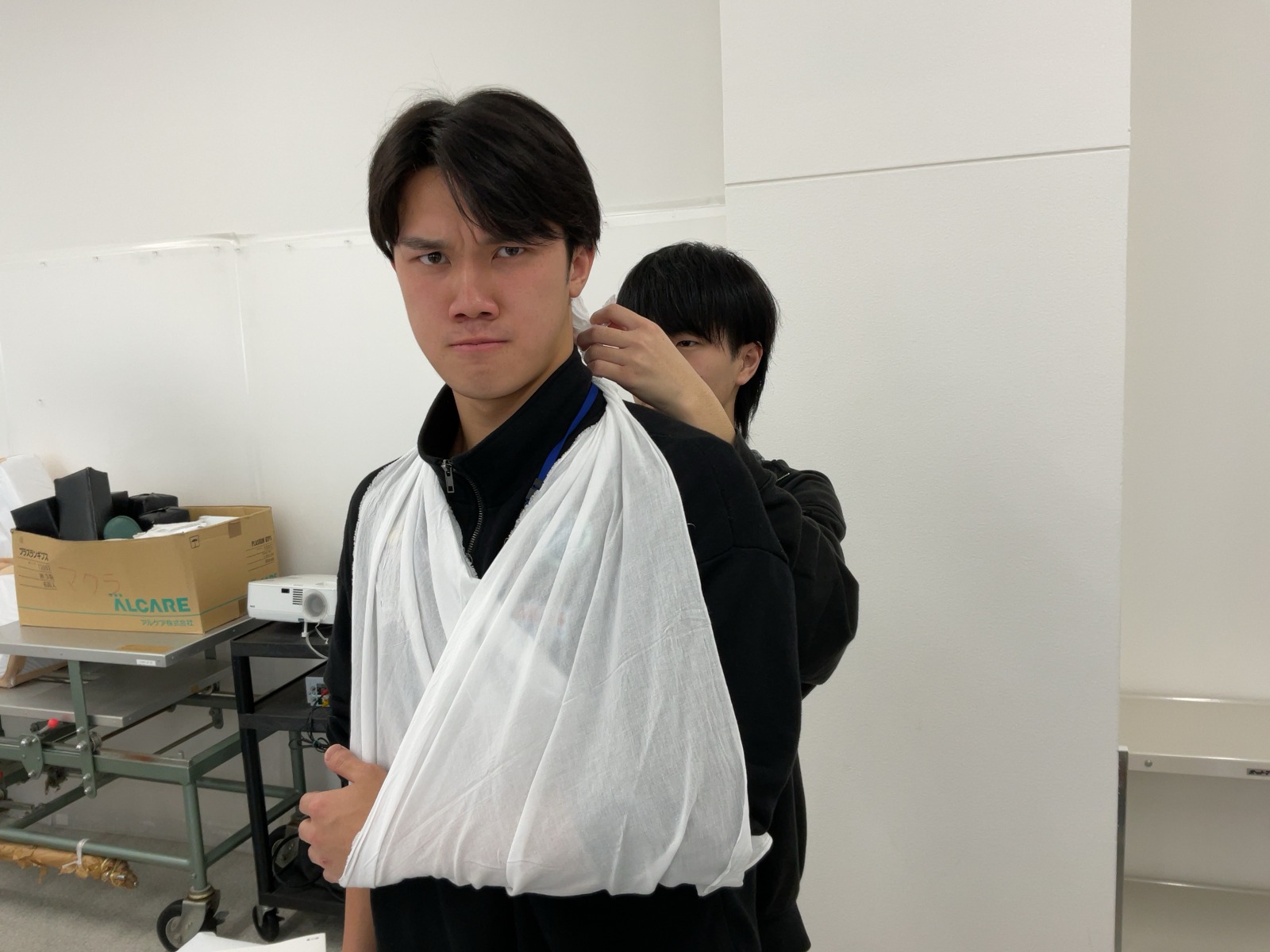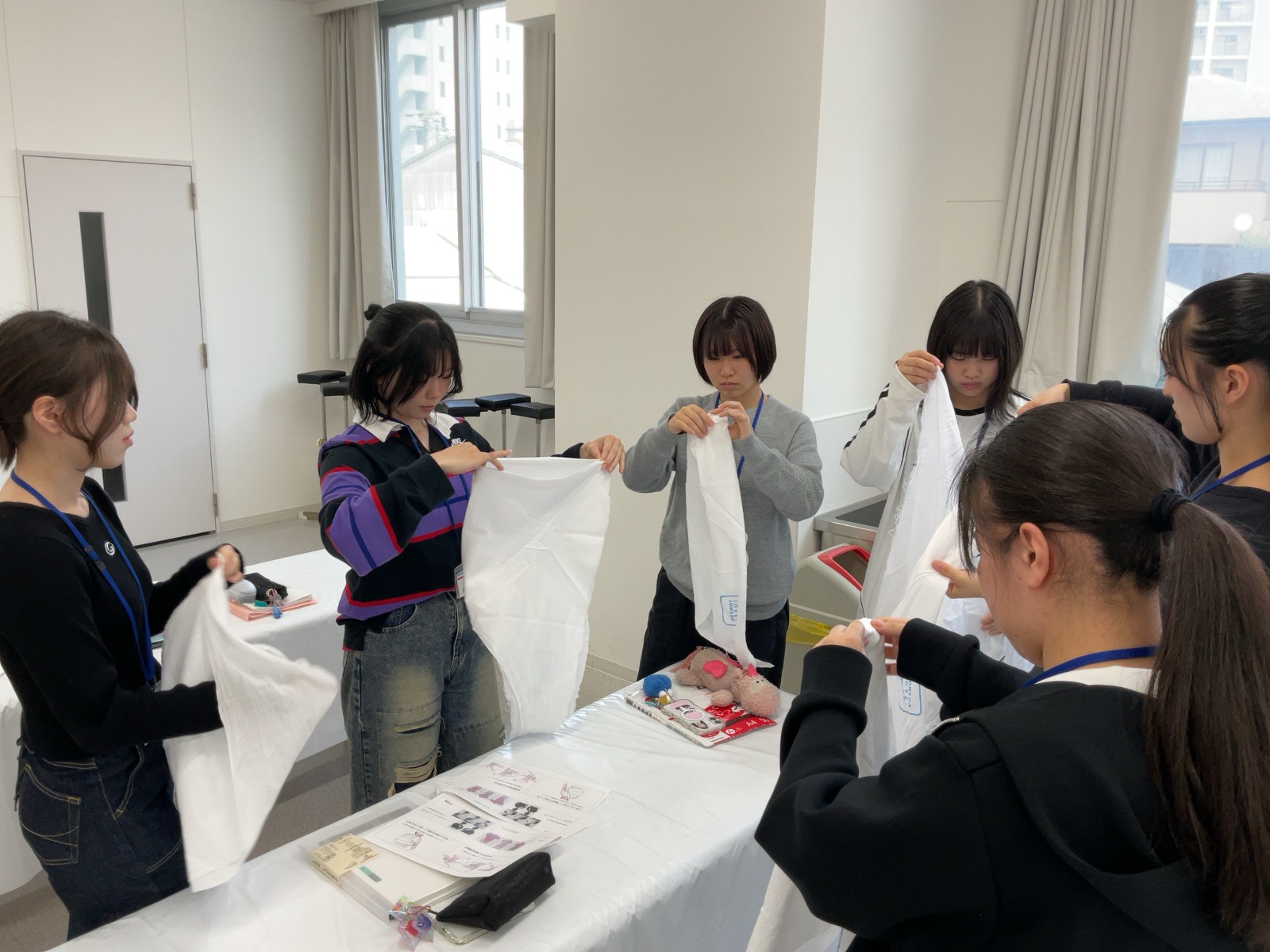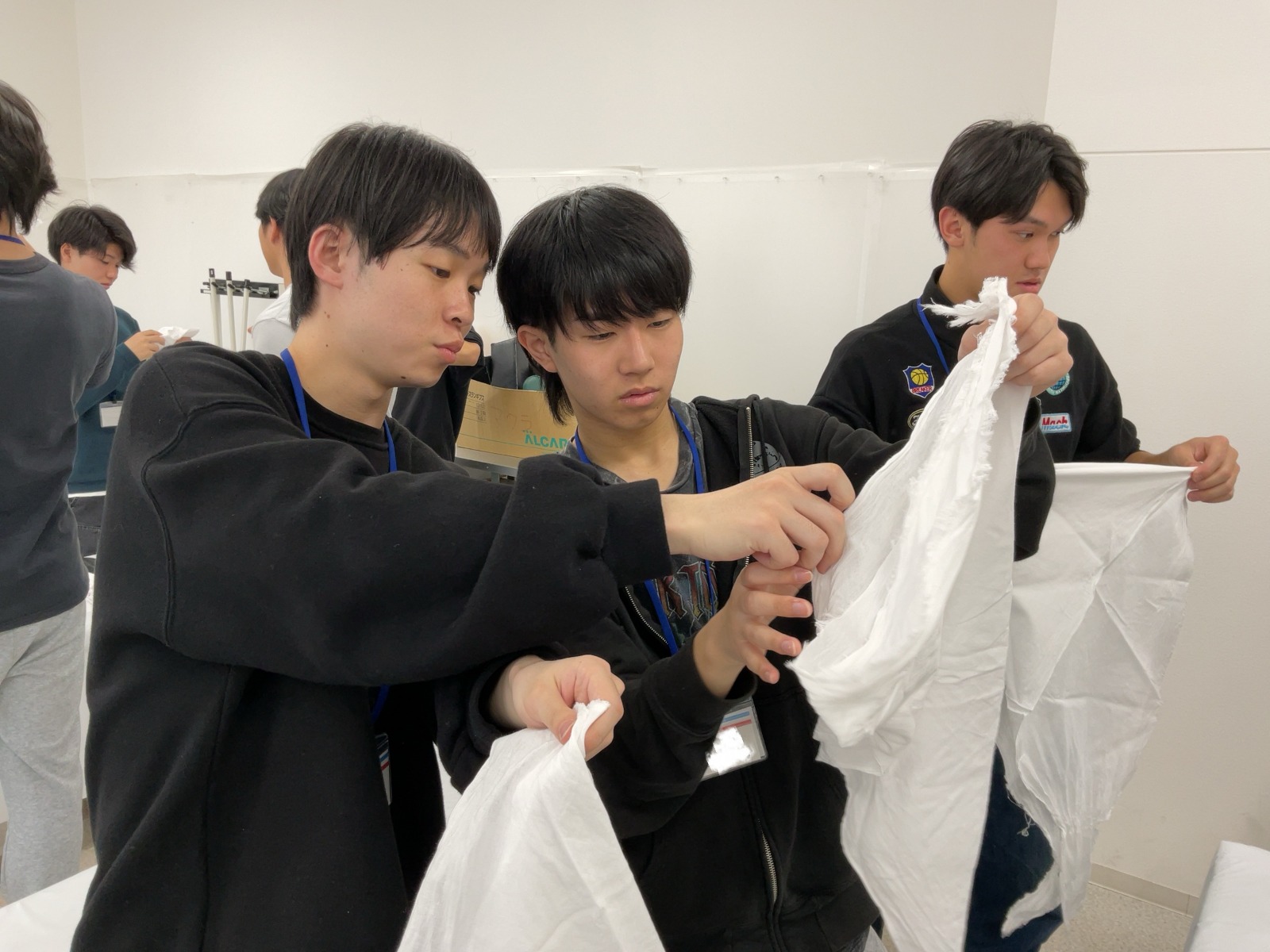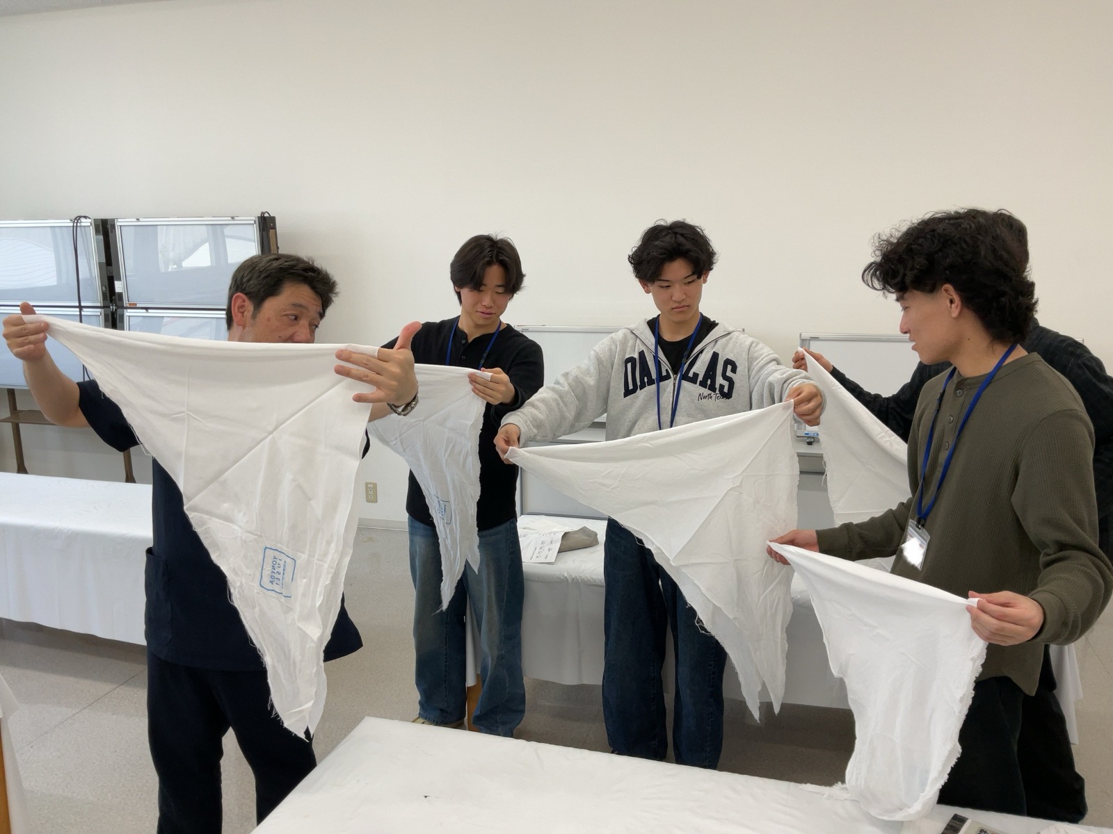 松原Tから三角巾の折り方を教わる