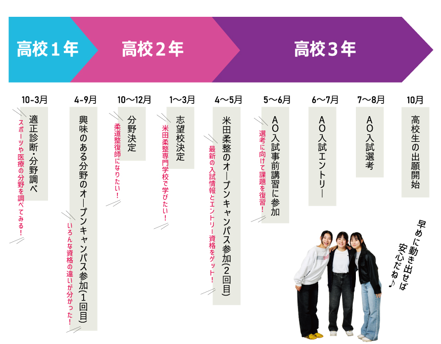 米田柔整専門学校は6~8月のAO入試と10月の一般入試、推薦入試でほとんどの定員が埋まってしまうため、6~10月に受験をするつもりで予定を立てることをおすすめします。