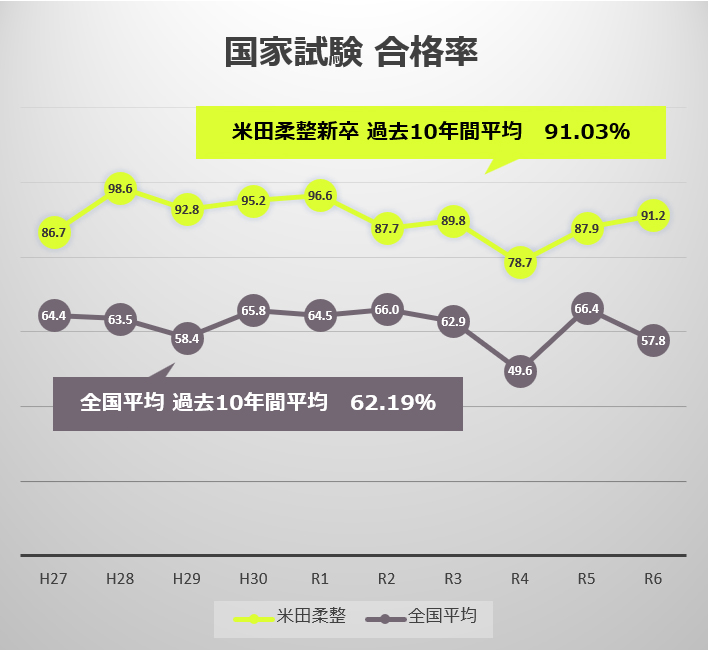米田柔整の国試合格率は常に平均を大きく上回っています。